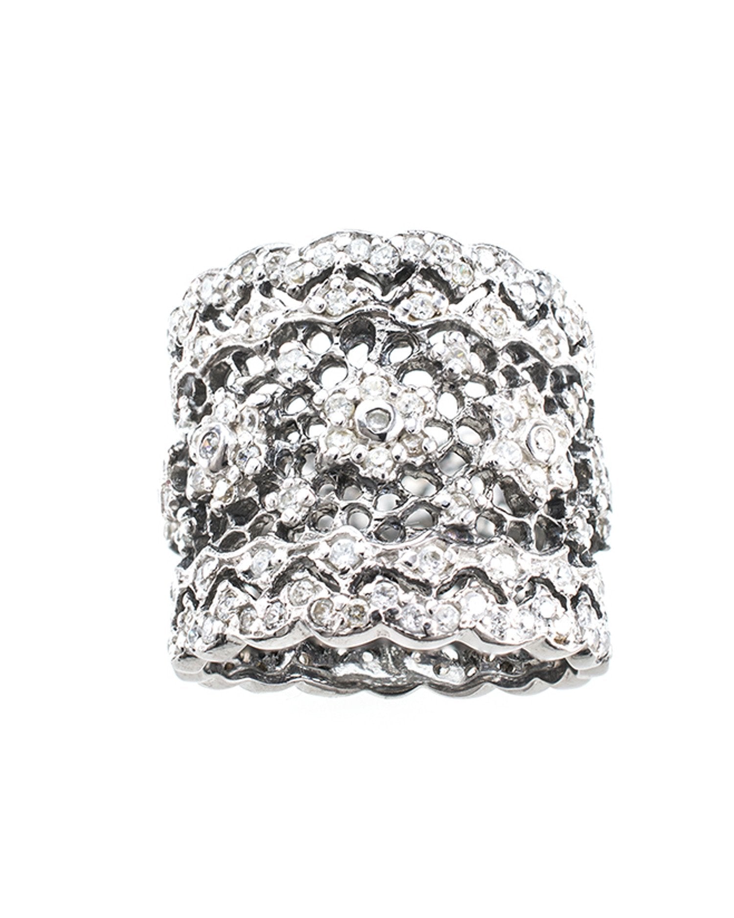 This beautiful Sterling Silver tapered "cigar band" style ring is in the classic Floral Lace design. The band is encrusted in the highest quality hand cut diamond simulants.