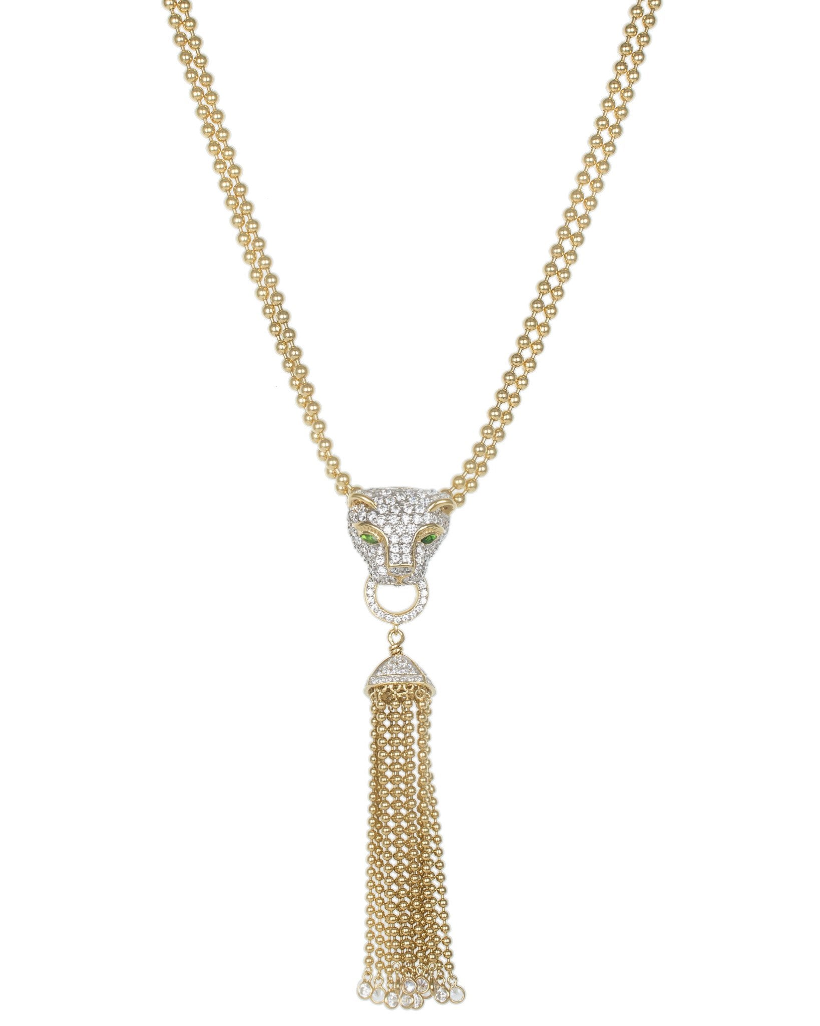 Elongated Sterling Silver bead chains layered in 18k Gold Vermeil necklace features a pave panther and elegant tassel pendant. Beautiful when worn alone or layered with multiple gold chains for an added statement. Panther is paved with hand cut and hand set diamond simulants.