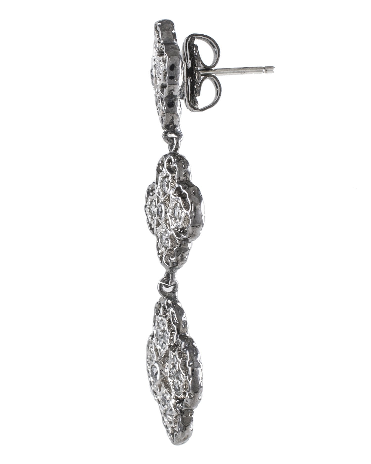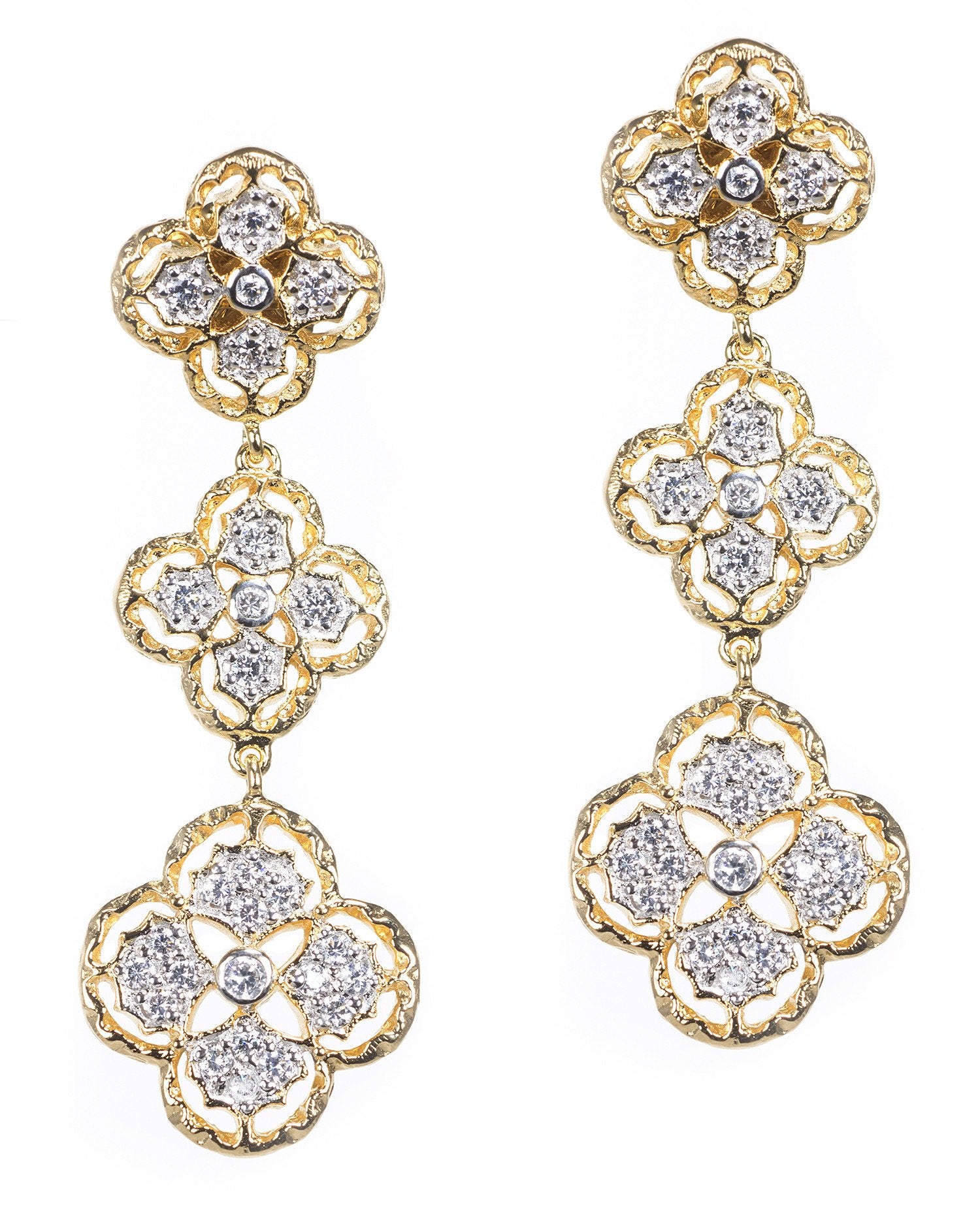 Elegant linear pierced earring featuring three graduated pave Romantic Lace Clovers. The centers of each clover leaf are paved in hand cut and hand set cubic zirconia.